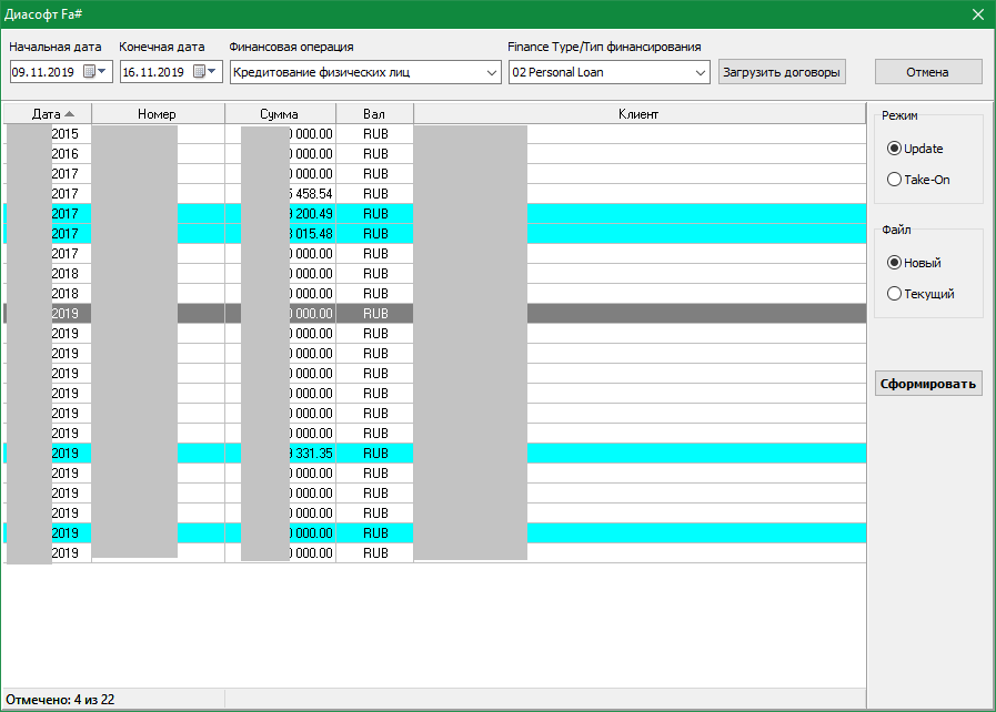 Программа может подключаться к базе данных АБС Диасофт Fa# и загружать из неё необходимую информацию. Для этого на стороне сервера должна быть создана хранимая процедура с именем "CDSEditGetInfo", возвращающая набор кредитных договоров либо таблицу с информацией по ним, в которой имена полей соответствуют идентификатором полей формата CAIS. В архиве лежит пример процедуры (для коммерческих кредитов), не претендующий на полноту и требующий доработки.